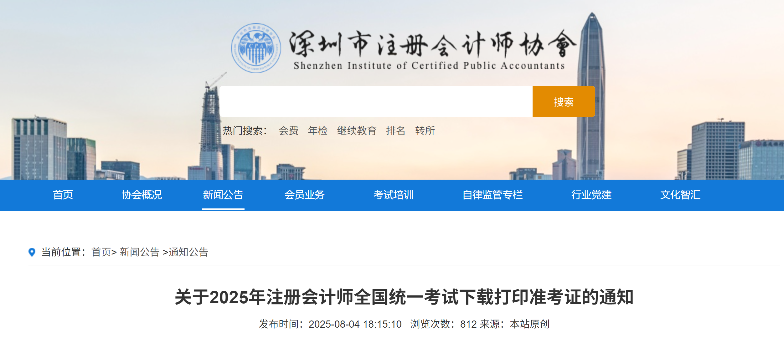 深圳:關于2025年注冊會計師考試下載打印準考證的通知