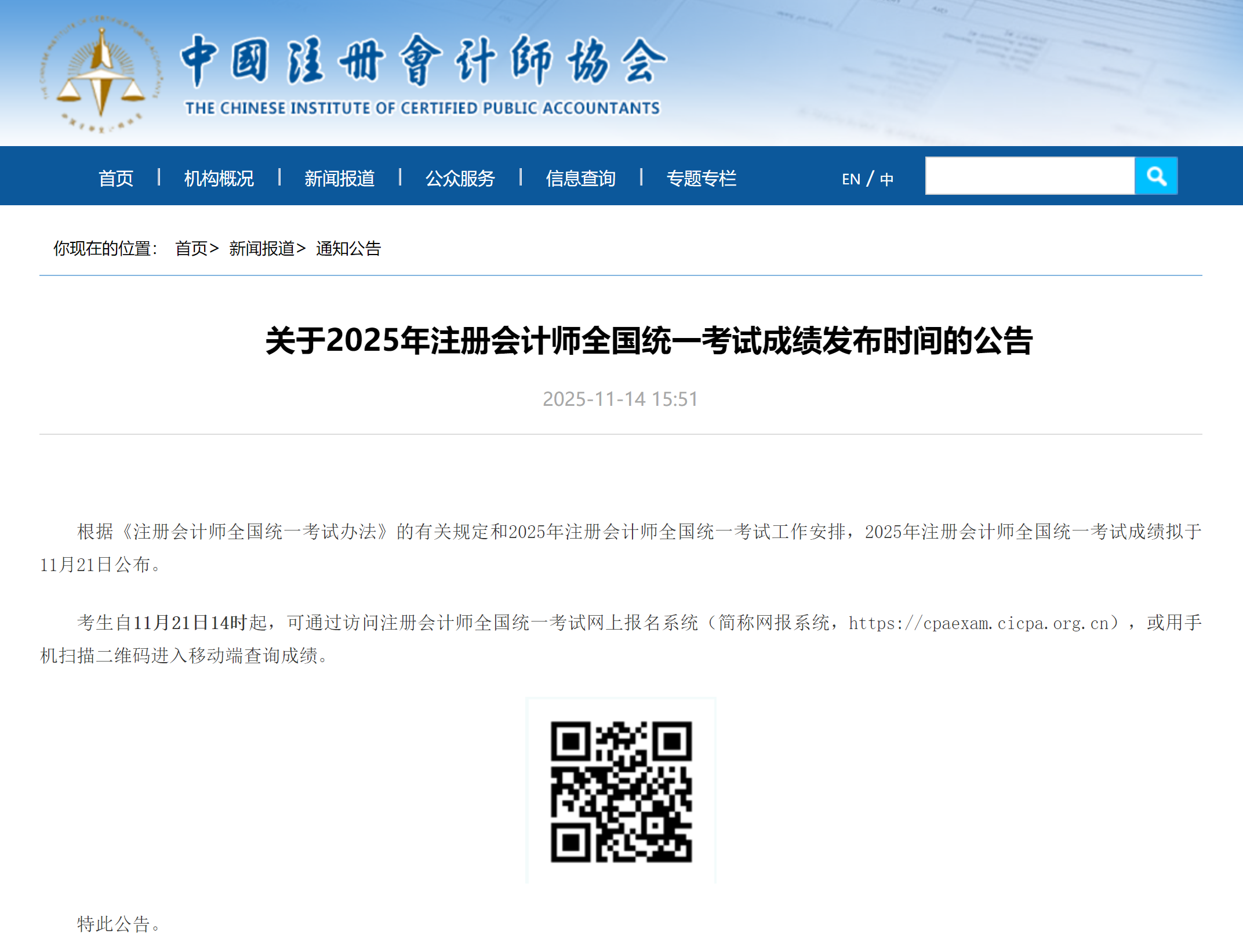 2025年注冊會計師全國統一考試成績擬于11月21日公布。考生自11月21日14時起,可通過訪問注冊會計師全國統一考試網上報名系統(簡稱網報系統,https://cpaexam.cicpa.org.cn),或用手機掃描二維碼進入移動端查詢成績。